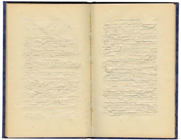 Hamilton’s installation indigo blue, in the exhibition “Places with a Past: New Site-Specific Art at Charleston’s Spoleto Festival,” 1991, was keyed to the historic importance of indigo, both as a plant and as a dye, in the economy of Charleston, South Carolina. The overriding presence in the installation was a mound of 14,000 carefully folded blue work shirts. A figure sat at a desk, back to the mound of shirts, reworking books with blue covers, which Hamilton had found in secondhand stores, and which were in fact military manuals regulating the establishment of legal boundaries between land and water. The figure in performance sat reading the books back to front, clearing each page, by a gesture of wetting a Pink Pearl eraser with saliva, rubbing out a line of text, and collecting the rubber eraser crumbs in a line parallel to the uppermost edge of the book and the front of the desk. The repetitive gesture, like the anonymous work clothes, echoed Hamilton’s readings in American labor history that had informed the making of this installation. Hamilton chose two different sets of books as traces of the event. This set, (indigo blue • books), comprises four books, completely erased, which are encased in a glass and wood vitrine. The second set (indigo blue • books II), 1991, comprises five books that are incompletely erased, and lacks the vitrine.