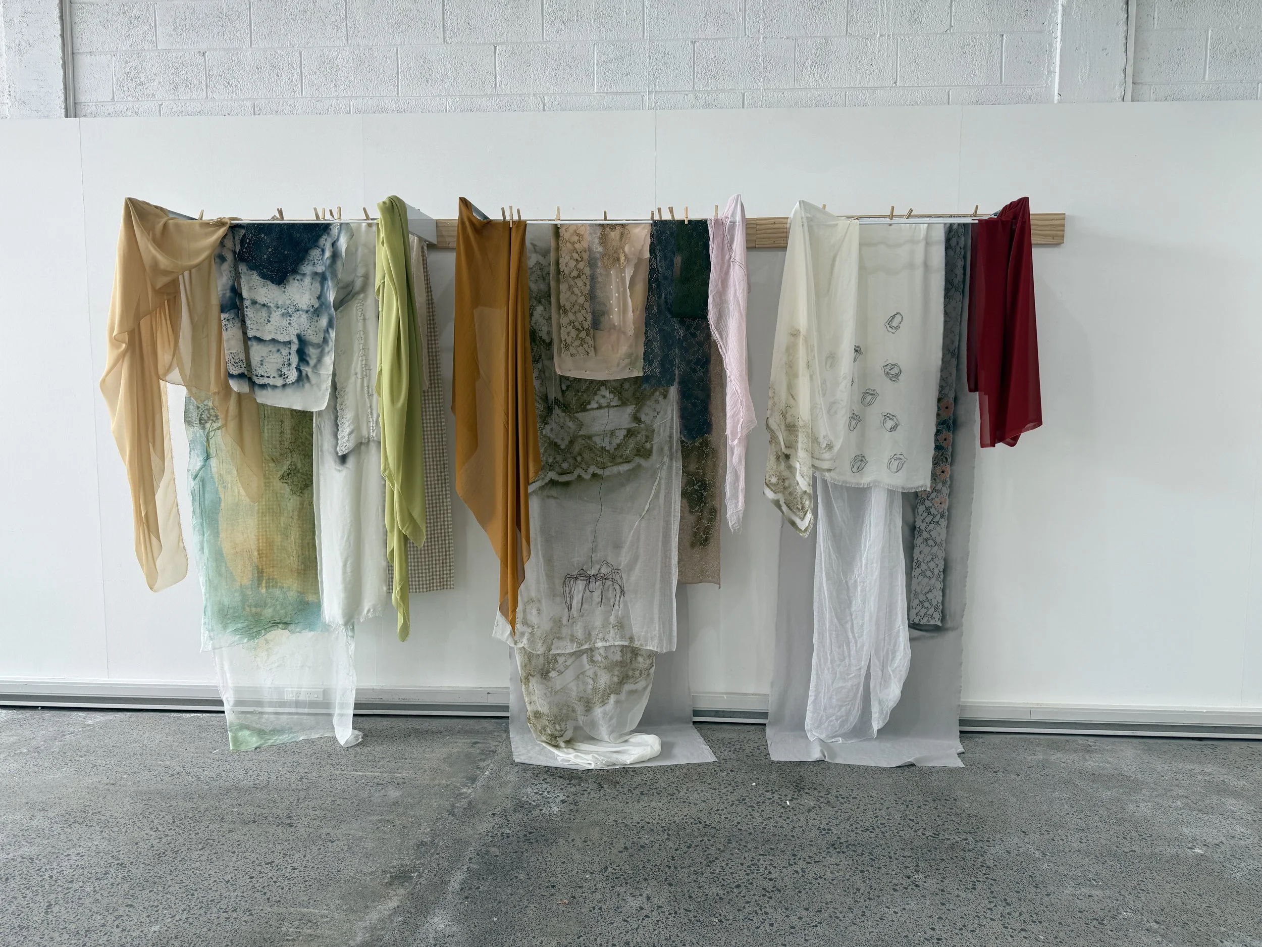 Initial hang with the three clothes racks. Spacing okay, need to cut down wooden supports so they don’t show either end. And paint white so they disappear into the wall. In order to hide the clothes racks, I need to arrange hanging fabric around the white metal. And perhaps get rid of the pegs or “age” the pegs, or overuse the pegs. (Also, pegs used to prop up the other paintings in conversation with these). Three women who communicated through weaving because they weren’t able to otherwise.